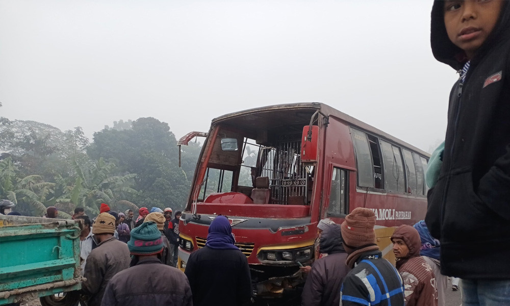ঠাকুরগাঁওয়ে ঘন কুয়াশার কারণে নিয়ন্ত্রণ হারিয়ে সড়কের আইল্যান্ডে ধাক্কা লেগে একটি নৈশ কোচ দুর্ঘটনার শিকার হয়েছে। এতে অন্তত সাত থেকে আটজন যাত্রী আহত হয়েছেন বলে স্থানীয়রা জানিয়েছেন। দুর্ঘটনায় শ্যামলী পরিবহনের কোচটির সামনের অংশ দুমড়েমুচড়ে যায়।