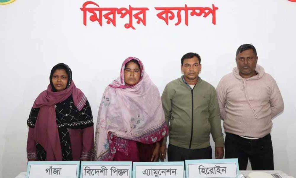 রাজধানীর পল্লবী থানাধীন বেগুনটিলা বস্তি এলাকায় যৌথ বাহিনীর অভিযানে অস্ত্র ও মাদকসহ এক মাদক সম্রাজ্ঞী ও তার তিন সহযোগীকে গ্রেপ্তার করা হয়েছে। গ্রেপ্তারদের মধ্যে রয়েছেন শাহাজাদীসহ তার নিকটাত্মীয় ও সহযোগীরা। অভিযানে বিপুল পরিমাণ মাদকদ্রব্য ও একটি বিদেশি পিস্তল উদ্ধার করা হয়।