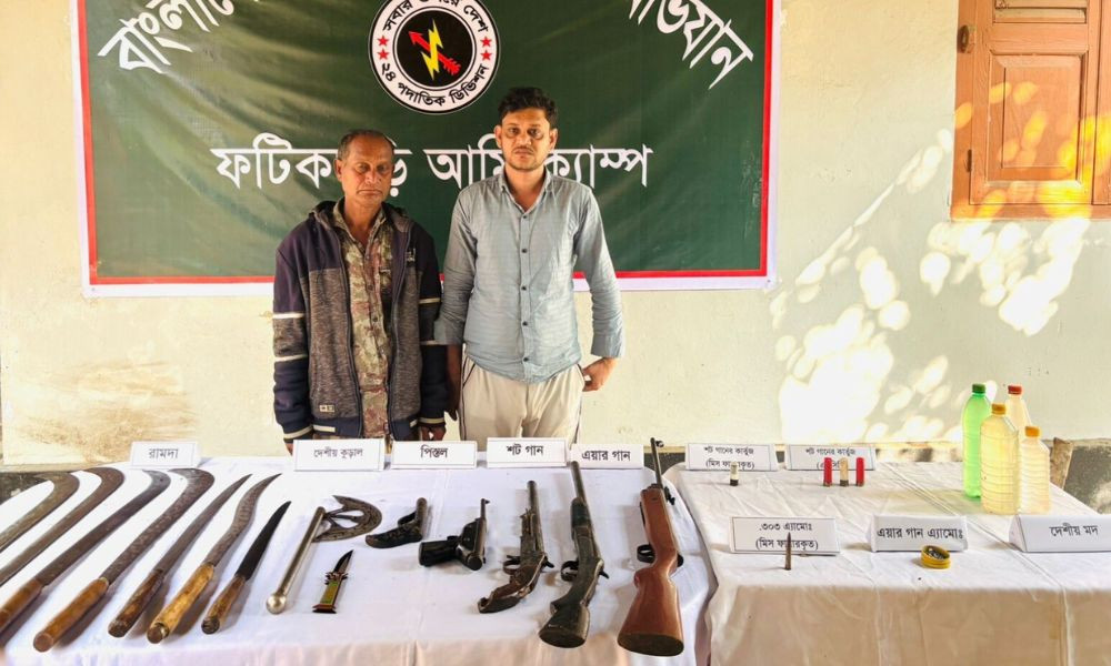 চট্টগ্রামের ফটিকছড়িতে গোয়েন্দা তথ্যের ভিত্তিতে বিশেষ অভিযান চালিয়ে বিপুল পরিমাণ অস্ত্র, গোলাবারুদ ও দেশীয় মদসহ দুই সন্ত্রাসীকে আটক করেছে বাংলাদেশ সেনাবাহিনী।