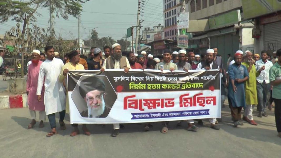 ইরানের সর্বোচ্চ ধর্মীয় নেতা আয়াতুল্লাহ আলী খামেনিকে হত্যা এবং ইরানে চলমান হামলার প্রতিবাদে গাইবান্ধা শহরে বিক্ষোভ মিছিল অনুষ্ঠিত হয়েছে। স্থানীয় একটি সংগঠনের উদ্যোগে আয়োজিত এই কর্মসূচিতে অংশ নেন বিভিন্ন শ্রেণি-পেশার মানুষ।
