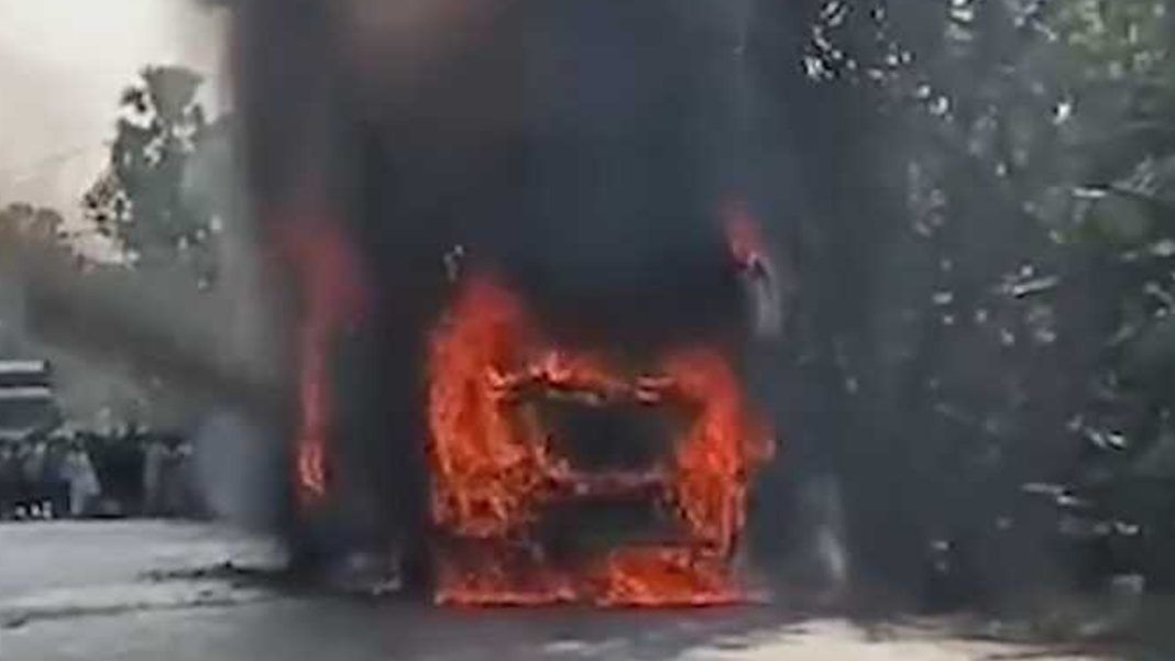 প্রত্যক্ষদর্শীরা জানান, মুহূর্তের মধ্যে বাসটি আগুনে পুড়তে শুরু করে। খবর পেয়ে ফায়ার সার্ভিস দ্রুত ঘটনাস্থলে পৌঁছে আগুন নিয়ন্ত্রণে আনে। তবে এর আগেই বাসটির অধিকাংশ অংশ পুড়ে যায়।