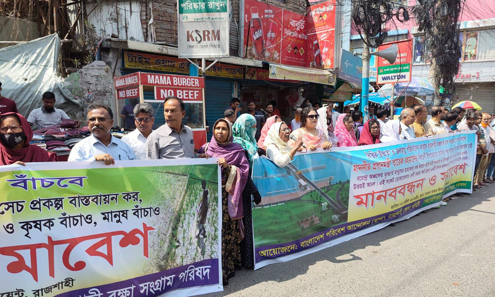 বৈশ্বিক উষ্ণতা ও জলবায়ু পরিবর্তনের প্রভাব থেকে রাজশাহী অঞ্চল রক্ষায় এবং নির্বাচনী ইশতেহারে ঘোষিত পদ্মা ব্যারেজ প্রকল্প দ্রুত বাস্তবায়নের দাবি জানিয়েছে বিভিন্ন সংগঠন। বুধবার (১ এপ্রিল) সকালে রাজশাহী নগরীর সাহেববাজার জিরোপয়েন্টে বাংলাদেশ পরিবেশ আন্দোলন (বাপা) রাজশাহী জেলা কমিটি ও রাজশাহী রক্ষা সংগ্রাম পরিষদের যৌথ উদ্যোগে মানববন্ধন অনুষ্ঠিত হয়।