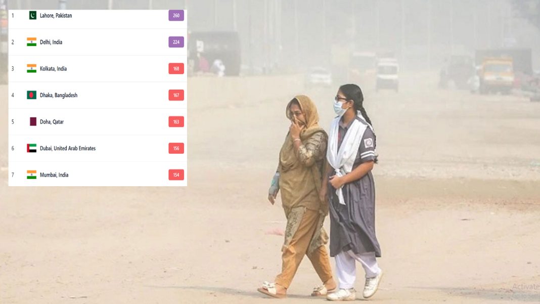 সুইজারল্যান্ডভিত্তিক বায়ু মান পর্যবেক্ষণ সংস্থা আইকিউএয়ারের তথ্য অনুযায়ী, দূষণের তালিকায় প্রথম স্থানে রয়েছে পাকিস্তানের লাহোর, যার স্কোর ২৬০। দ্বিতীয় স্থানে ভারতের রাজধানী দিল্লি (স্কোর ২২৪) এবং তৃতীয় স্থানে কলকাতা (স্কোর ১৬৮)। পঞ্চম স্থানে রয়েছে কাতারের রাজধানী দোহা, যার স্কোর ১৬৩। শীর্ষ দশে থাকা অন্যান্য শহরের বায়ু মানের সূচক ১৫৭ থেকে ১৩৯ এর মধ্যে ঘোরাফেরা করছে।