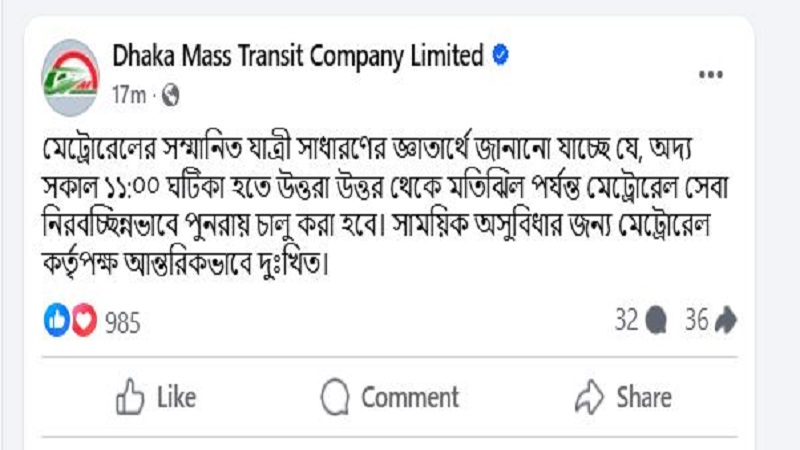 ঢাকা ম্যাস ট্রানজিট কোম্পানি লিমিটেড (ডিএমটিসিএল) তাদের ভেরিফায়েড ফেসবুক পেজে জানিয়েছে, যাত্রীদের সাময়িক অসুবিধার জন্য তারা আন্তরিকভাবে দুঃখ প্রকাশ করছে।
