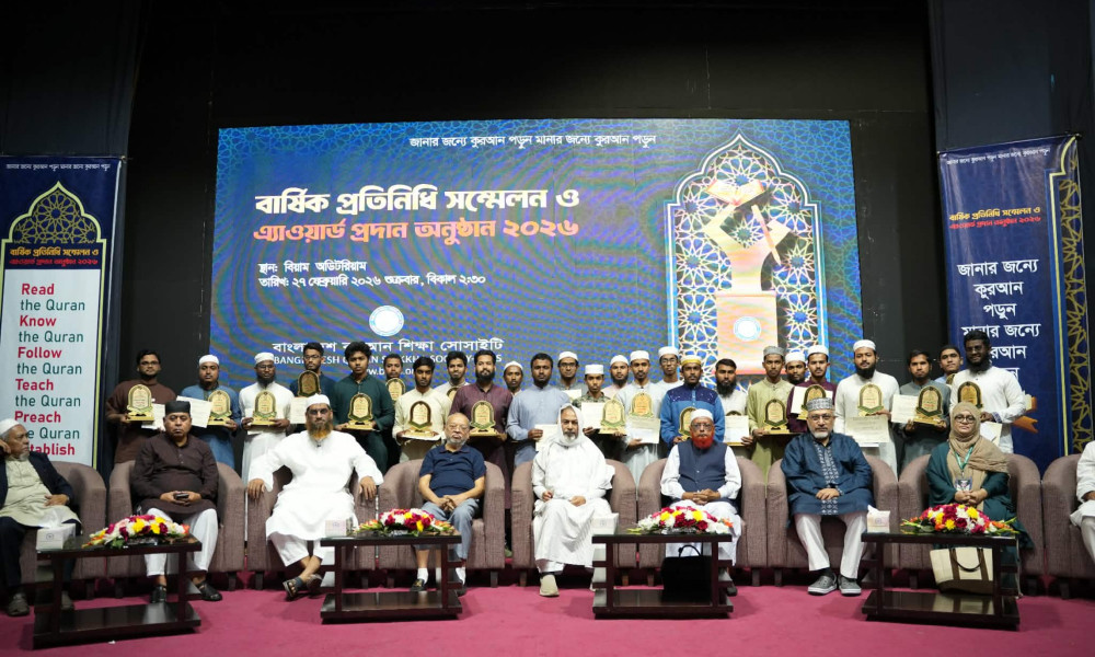 বাংলাদেশ কোরআন শিক্ষা সোসাইটির উদ্যোগে শুক্রবার (২৭ ফেব্রুয়ারি) জুমার পর দুপুর ২টা ৩০ মিনিটে ঢাকার ৬৩ নিউস্কাটনস্থ বিয়াম অডিটরিয়ামে বার্ষিক প্রতিনিধি সম্মেলন ও অ্যাওয়ার্ড প্রদান অনুষ্ঠান অনুষ্ঠিত হয়। অনুষ্ঠানে সভাপতিত্ব করেন সোসাইটির সভাপতি মাওলানা আবদুস শহীদ নাসিম এবং অনুষ্ঠানটি যৌথভাবে পরিচালনা করেন সহসভাপতি মাহফুজুর রহমান ও সহকারী জেনারেল সেক্রেটারি আরশাদ মঞ্জুর চৌধুরী।