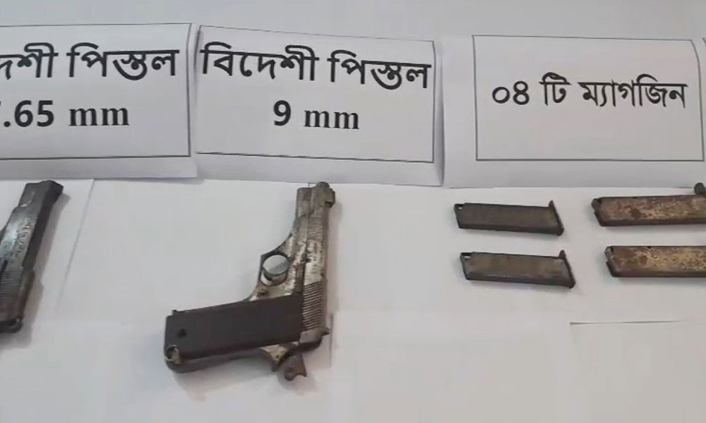একটি শপিং ব্যাগ থেকে একটি ৭.৬৫ এমএম বোরের বিদেশি পিস্তল, দুটি ম্যাগাজিন এবং ১০ রাউন্ড তাজা গুলি উদ্ধার করা হয়। অন্য ব্যাগে পাওয়া যায় একটি ৯ এমএম বিদেশি পিস্তল, দুটি ম্যাগাজিন ও ৭ রাউন্ড তাজা গুলি।