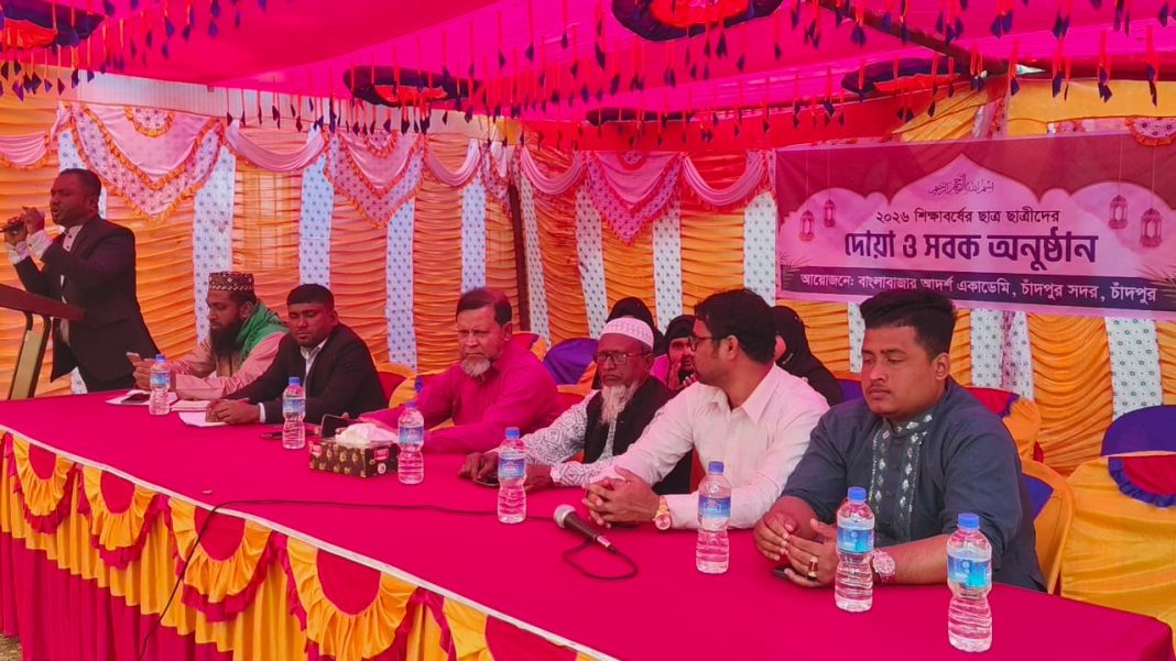 চাঁদপুর সদর উপজেলার বখরপুরস্থ ঐতিহ্যবাহী শিক্ষা প্রতিষ্ঠান বাংলা বাজার আদর্শ একাডেমি-তে নতুন শিক্ষাবর্ষের শিক্ষার্থীদের ‘দোয়া ও সবক অনুষ্ঠান’ অনুষ্ঠিত হয়েছে। বৃহস্পতিবার (১৫ জানুয়ারি) বিদ্যালয় প্রাঙ্গণে আয়োজিত এই অনুষ্ঠানে প্রধান অতিথি হিসেবে উপস্থিত ছিলেন একাডেমির সভাপতি ও চাঁদপুর জজ কোর্টের অতিরিক্ত পিপি অ্যাডভোকেট শাহজাহান খান।