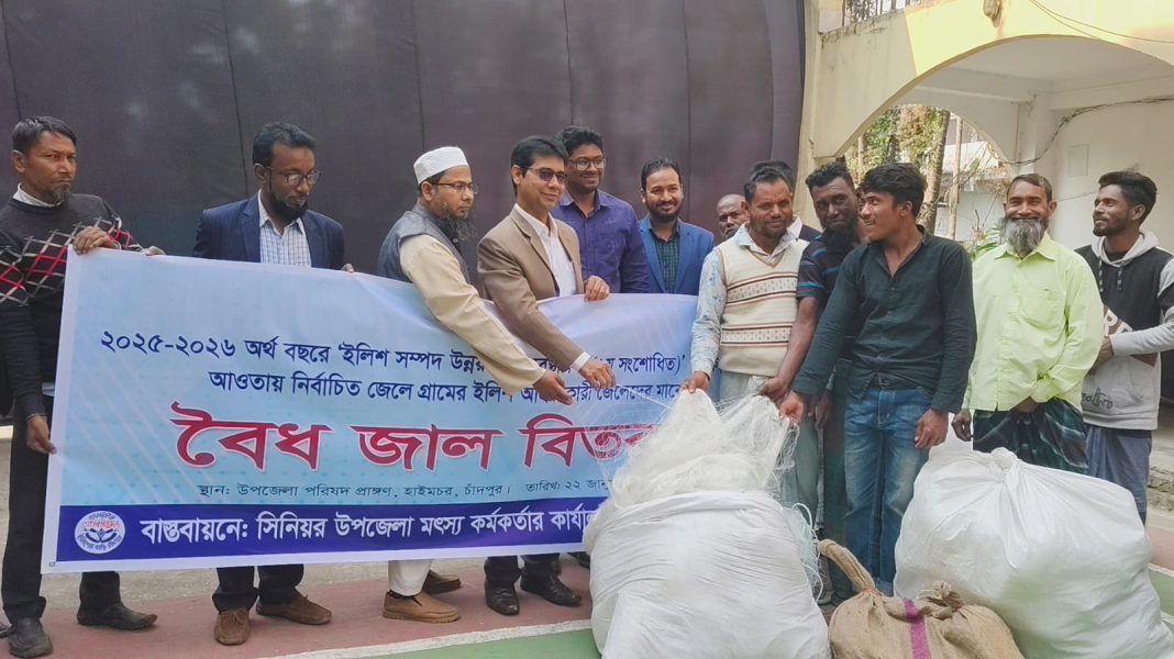 জাতীয় অর্থনীতিতে ইলিশের অবদান সুসংহত করতে এবং জাটকা ও মা ইলিশ রক্ষায় সরকারের প্রচেষ্টার অংশ হিসেবে চাঁদপুরের হাইমচরে নিবন্ধিত জেলেদের মাঝে বৈধ জাল বিতরণ করা হয়েছে।