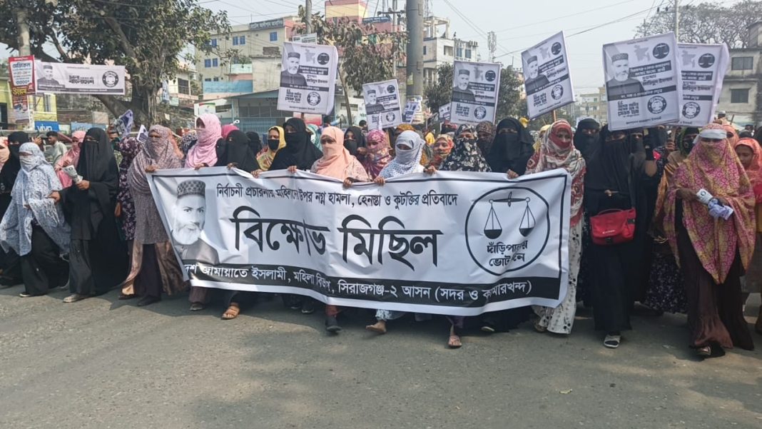 সারাদেশে নির্বাচনী প্রচারণাকালে নারীদের উপর নগ্ন হামলা, হেনস্তা ও কটুক্তির প্রতিবাদে বাংলাদেশ জামায়াতে ইসলামী সিরাজগঞ্জ-২ (সদর ও কামারখন্দ) আসনের মহিলা বিভাগের উদ্যোগে বিক্ষোভ মিছিল অনুষ্ঠিত হয়েছে।