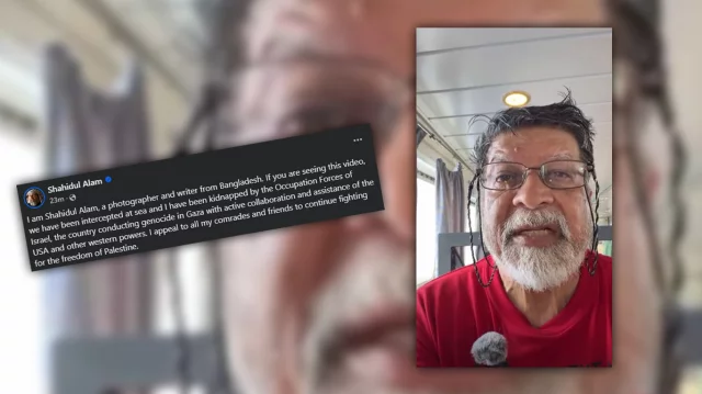 বাংলাদেশি আলোকচিত্রী ও মানবাধিকারকর্মী শহিদুল আলম বলেছেন, ইসরায়েলি বাহিনী তাকে অপহরণ করেছে—এমনই দাবি তিনি তার ভেরিফায়েড ফেসবুক অ্যাকাউন্টে প্রকাশিত এক ভিডিও বার্তায় করেছেন। শহিদুল আলম বর্তমানে গাজামুখী ফ্রিডম ফ্লোটিলা কোয়ালিশনের (এফএফসি) একটি অংশ কনশেনস জাহাজে ছিলেন বলে জানা গেছে।