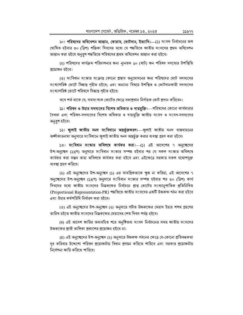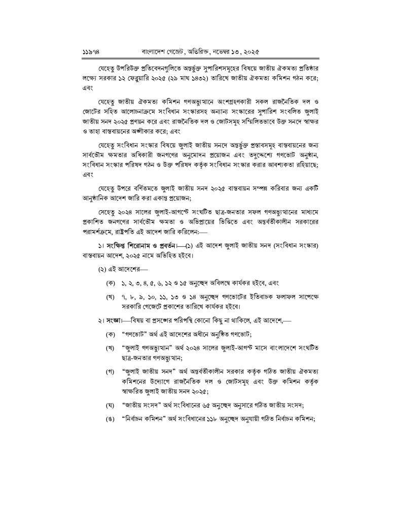 সরকার ‘জাতীয় জুলাই সনদ (সংবিধান সংস্কার) বাস্তবায়ন আদেশ-২০২৫’ জারি করেছে, যা দেশের রাজনৈতিক সংস্কারের ইতিহাসে এক নতুন অধ্যায়ের সূচনা হিসেবে বিবেচিত হচ্ছে। বৃহস্পতিবার (১৩ নভেম্বর) আইন, বিচার ও সংসদবিষয়ক মন্ত্রণালয়ের লেজিসলেটিভ ও সংসদবিষয়ক বিভাগ থেকে এ-সংক্রান্ত গেজেট প্রকাশ করা হয়।