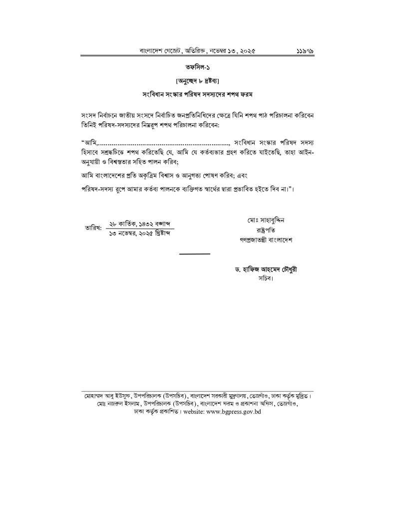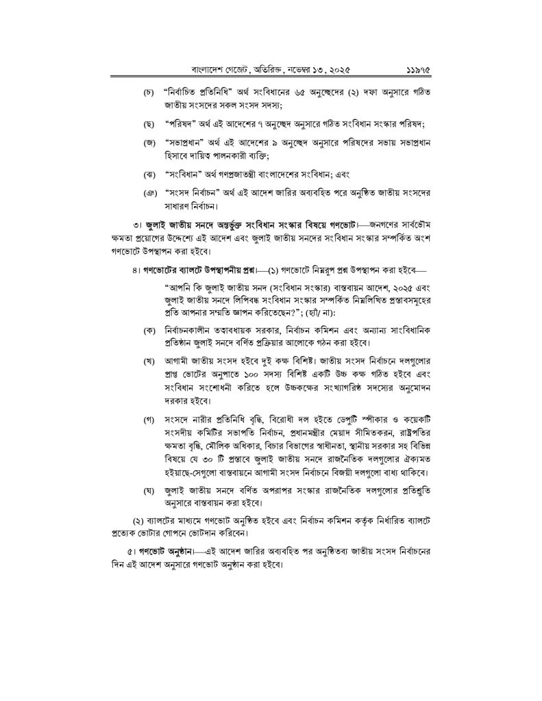 এর আগে একই দিনে রাষ্ট্রপতি মো. সাহাবুদ্দিন আনুষ্ঠানিকভাবে আদেশে স্বাক্ষর করেন। এর মধ্য দিয়ে ‘জুলাই জাতীয় সনদ বাস্তবায়ন’ সংক্রান্ত সব প্রক্রিয়া সম্পন্ন হয় এবং এখন এটি গণভোটে তোলার জন্য আইনি বৈধতা পেল।