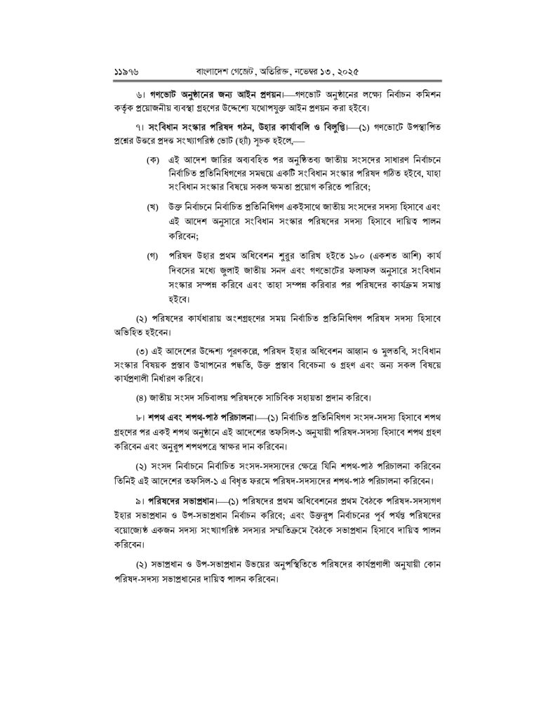 সরকারি সূত্র জানায়, এই আদেশের মাধ্যমে সংবিধান সংস্কারের প্রস্তাবগুলো জনগণের সামনে গণভোটের মাধ্যমে উপস্থাপন করা হবে। রাজনৈতিক দলগুলোর মধ্যে যে ঐকমত্য গঠিত হয়েছে, তার ভিত্তিতেই প্রস্তাবিত পরিবর্তনগুলো জনগণের মতামতের জন্য তোলা হবে। গণভোটের দিন নির্ধারণ এবং ভোটগ্রহণের প্রক্রিয়া নিয়ে নির্বাচন কমিশন শিগগিরই বিস্তারিত কর্মসূচি ঘোষণা করবে বলে সংশ্লিষ্ট সূত্রে জানা গেছে।