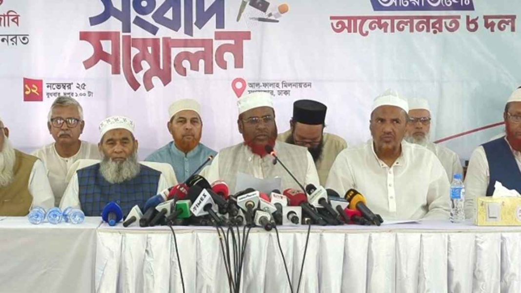 ১৬ নভেম্বরের মধ্যে পাঁচ দফা দাবি বাস্তবায়ন না হলে প্রধান উপদেষ্টার সরকারি বাসভবন ‘যমুনা’র সামনে অনির্দিষ্টকালের অবস্থান কর্মসূচির হুঁশিয়ারি দিয়েছে জামায়াতে ইসলামীসহ আটটি ইসলামি দল। বুধবার (১২ নভেম্বর) দুপুরে আট দলের শীর্ষ নেতাদের বৈঠক শেষে সংবাদ সম্মেলনে এই ঘোষণা দেন জামায়াতে ইসলামীর নায়েবে আমির অধ্যাপক মুজিবুর রহমান। এ সময় আট দলের কেন্দ্রীয় ও মহানগর পর্যায়ের নেতারা উপস্থিত ছিলেন।