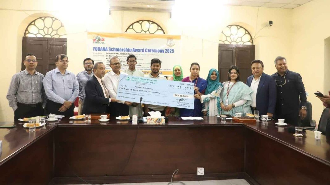 উচ্চশিক্ষায় সাফল্য ও গবেষণার আগ্রহের ভিত্তিতে জাহাঙ্গীরনগর বিশ্ববিদ্যালয়ের পাঁচ শিক্ষার্থীকে ফেডারেশন অব বাংলাদেশ অ্যাসোসিয়েশন ইন নর্থ আমেরিকা (ফোবানা) বৃত্তি প্রদান করেছে। বুধবার (১৯ নভেম্বর) বিশ্ববিদ্যালয়ের উপাচার্যের কনফারেন্স রুমে অনুষ্ঠানে শিক্ষার্থীদের হাতে এই স্বীকৃতি তুলে দেওয়া হয়।