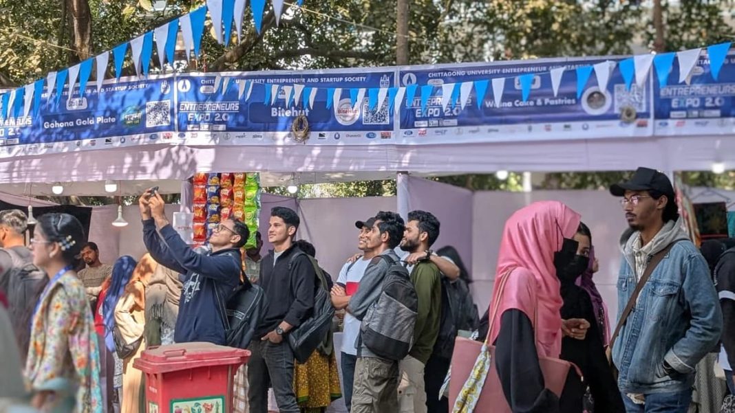 চট্টগ্রাম বিশ্ববিদ্যালয়ের বুদ্ধিজীবী চত্বরে তিনদিনব্যাপী Entrepreneurship Expo ২০২৬ শুরু হয়েছে। শুক্রবার (২৪ জানুয়ারি) সকাল ৯টায় আনুষ্ঠানিকভাবে শুরু হওয়া এই এক্সপোতে প্রথম দিন থেকেই দর্শনার্থীদের ব্যাপক উপস্থিতি ও জমজমাট বেচাকেনা লক্ষ্য করা গেছে।