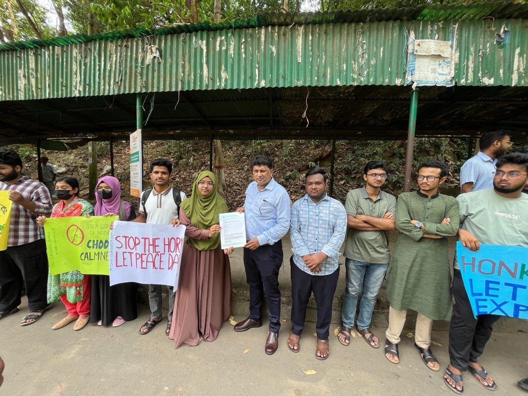 এসময় শিক্ষার্থীরা “আর নয় শব্দ, হর্ন করি জব্দ, নো হর্ন নীতি ধরি সবুজ ক্যাম্পাস গড়ি” স্লোগান প্রদান করেন।