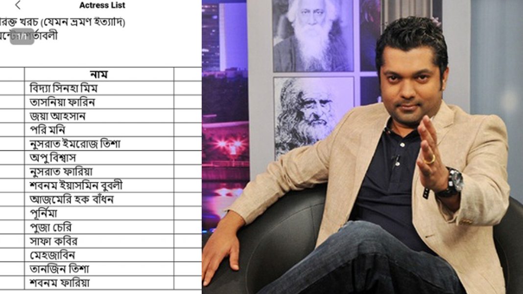 বৃহস্পতিবার (৫ মার্চ) জয় ভেরিফায়েড ফেসবুকে স্ক্রিনশটে এই নায়িকাদের নামের তালিকা প্রকাশ করেন। তালিকায় রয়েছে বিদ্যা সিনহা মিম, তাসনিয়া ফারিন, জয়া আহসান, পরীমণি, নুসরাত ইমরোজ তিশা, অপু বিশ্বাস, নুসরাত ফারিয়া, শবনম ইয়াসমিন বুবলী, আজমেরি হক বাঁধন, পূর্ণিমা, পূজা চেরি, সাফা কবির, মেহজাবিন, তানজিন তিশা এবং শবনম ফারিয়া।