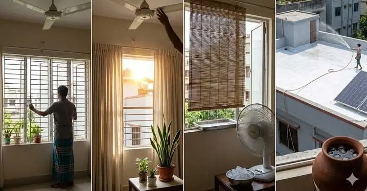 মেঝে ভেজা কাপড় দিয়ে মোছা হলে তা বাষ্পীভূত হয়ে ঠান্ডা অনুভূতি দেয়। দিনের বেলায় প্রাকৃতিক আলো ব্যবহার এবং রাতে সঠিকভাবে বাতাস চলাচল নিশ্চিত করলে ঘর আরামদায়ক থাকে।