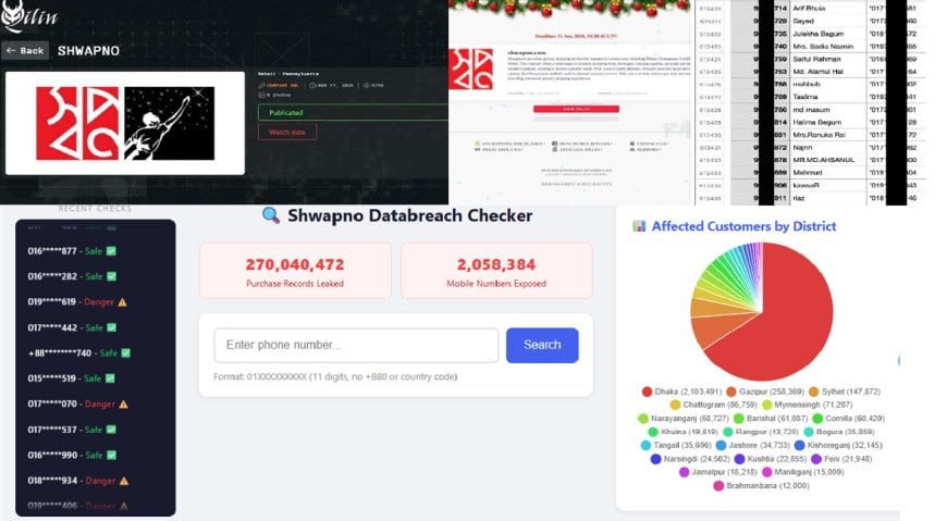দেশের সুপারশপ চেইন স্বপ্ন’র বিপুল পরিমাণ গ্রাহক তথ্য ফাঁস হওয়ার অভিযোগ উঠেছে। ২০২৫ সালে যারা প্রতিষ্ঠানটি থেকে কেনাকাটা করেছেন, তাদের ডেটাবেজ অনলাইনে ছড়িয়ে পড়েছে বলে দাবি করা হচ্ছে। একটি ডাটাব্রিজ চেকার প্রকাশ করেছে একটি হ্যাকার দল, যেখানে ব্যবহারকারীরা নিজেদের তথ্য যাচাই করছেন।