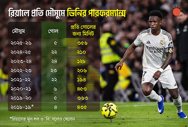 চলতি মৌসুমে ভিনিসিয়ুস খেলেছেন ২৪ ম্যাচ। গোল করেছেন মাত্র ৫টি। এর মধ্যে ৪টি এসেছে ওপেন প্লে থেকে, একটি পেনাল্টি থেকে। এই মৌসুমে তাঁর গোলের গড় দাঁড়িয়েছে প্রতি ৩৫৬ মিনিটে একটি। আগের দুই মৌসুমের সঙ্গে তুলনা করলে পার্থক্য চোখে পড়ে। গত মৌসুমে তিনি প্রতি ২১০ মিনিটে একটি করে গোল করেন, তার আগের মৌসুমে এই হার ছিল প্রতি ১২৮ মিনিটে একটি।