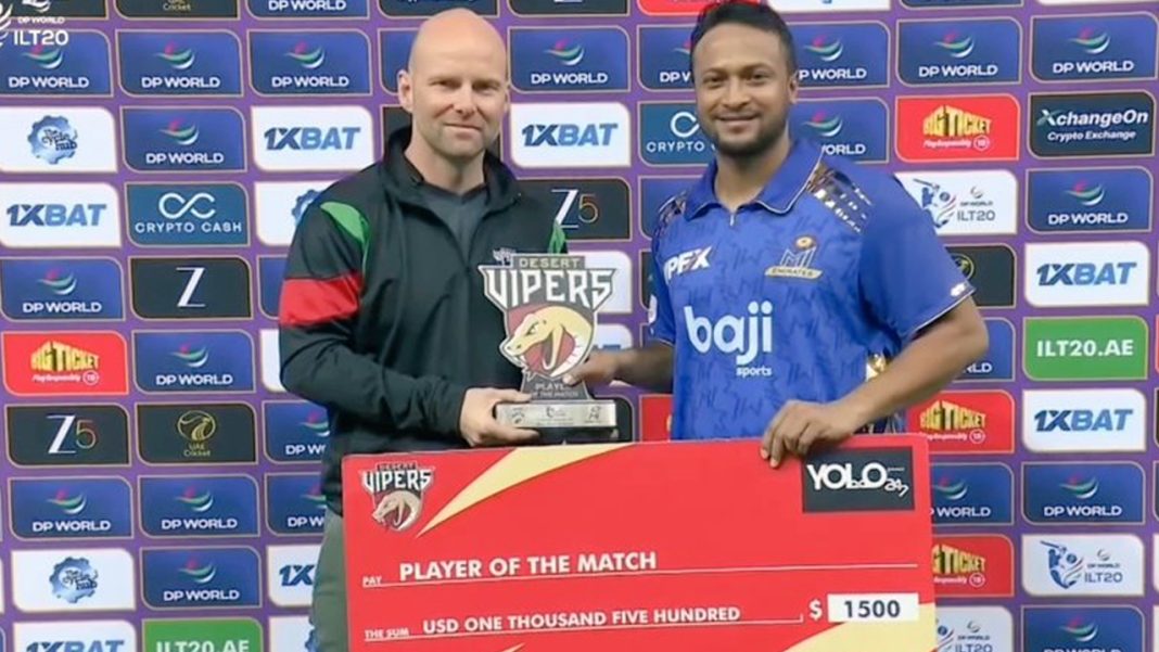ইন্টারন্যাশনাল লিগ টি-টোয়েন্টিতে (আইএল টি-টোয়েন্টি) নিজের সামর্থ্যের পূর্ণ ঝলক দেখালেন সাকিব আল হাসান। অভিষেকের পর প্রথম দুই ম্যাচে বিবর্ণ থাকলেও ডেজার্ট ভাইপার্সের বিপক্ষে দুর্দান্ত অলরাউন্ড পারফরম্যান্সে ম্যাচসেরা হয়ে আবারও প্রমাণ করলেন— ফর্ম ইজ টেম্পোরারি, ক্লাস ইজ পার্মানেন্ট।