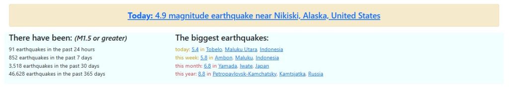 বিশ্বব্যাপী ভূমিকম্পের তথ্য সরবরাহকারী জনপ্রিয় ওয়েবসাইট ‘আর্থকোয়াকট্র্যাকার ডটকম’ রোববার (২৩ নভেম্বর) দুপুরে জানায়, গত ২৪ ঘণ্টায় বিশ্বের বিভিন্ন স্থানে ৯১টি ভূমিকম্প হয়েছে। এছাড়া, গত সাতদিনে অন্তত ৮৫২টি ভূমিকম্পের ঘটনা ঘটেছে।