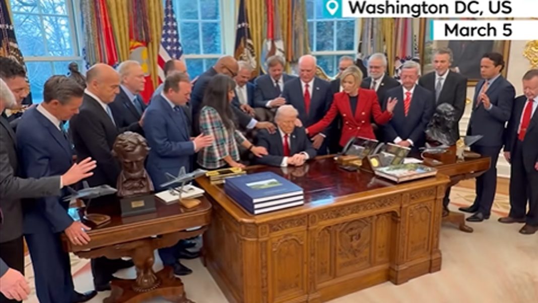 হোয়াইট হাউসের ওভাল অফিসে জড়ো হয়ে তারা ট্রাম্পের কাঁধে হাত রেখে তার নেতৃত্বে যুদ্ধ পরিস্থিতি মোকাবিলায় সাফল্যের জন্য প্রার্থনা করেন। ঘটনাটির একটি ভিডিও সামাজিক যোগাযোগমাধ্যমে ছড়িয়ে পড়ার পর তা নিয়ে ব্যাপক আলোচনা শুরু হয়েছে।